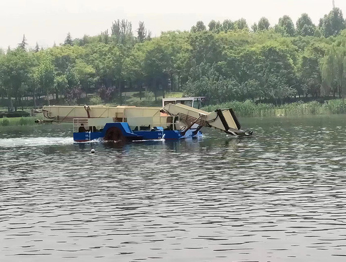 O barco de cortar é uma moderna planta aquática e água jacinto colheita e equipamento de transporte adequado
